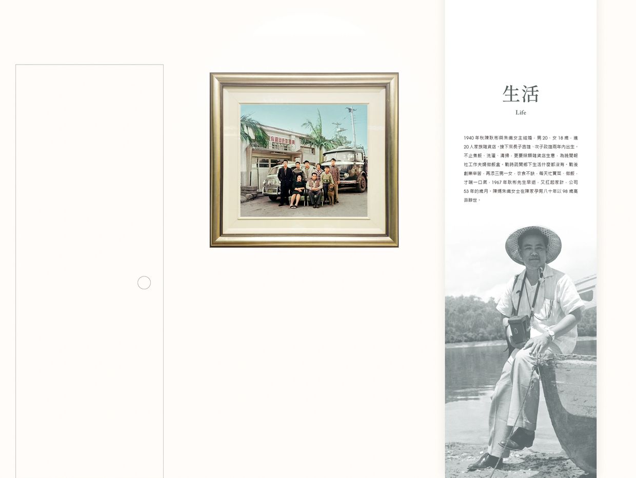 1940年秋陳耿彬與朱織女主結婚,男20、女18歲,進20人家族雜貨店。接下來長子吉雄、次子政雄兩年內出生。不止煮飯、洗濯、清掃,更要照顧雜貨店生意,為晚間報社工作夫婿做飯盒。戰時疏開鄉下生活什麼都沒有。戰後創業辛苦,再添三男一女,衣食不缺,每天忙買菜、做飯,才喘一口氣,1967 年耿彬先生早逝,又扛起家計,公司53 年的歲月。陳媽朱織女士在陳家孕育八十年以98 歲高壽辭世。